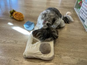 大きいおもちゃを頑張ってくわえたり、おやつさがしに夢中だったり